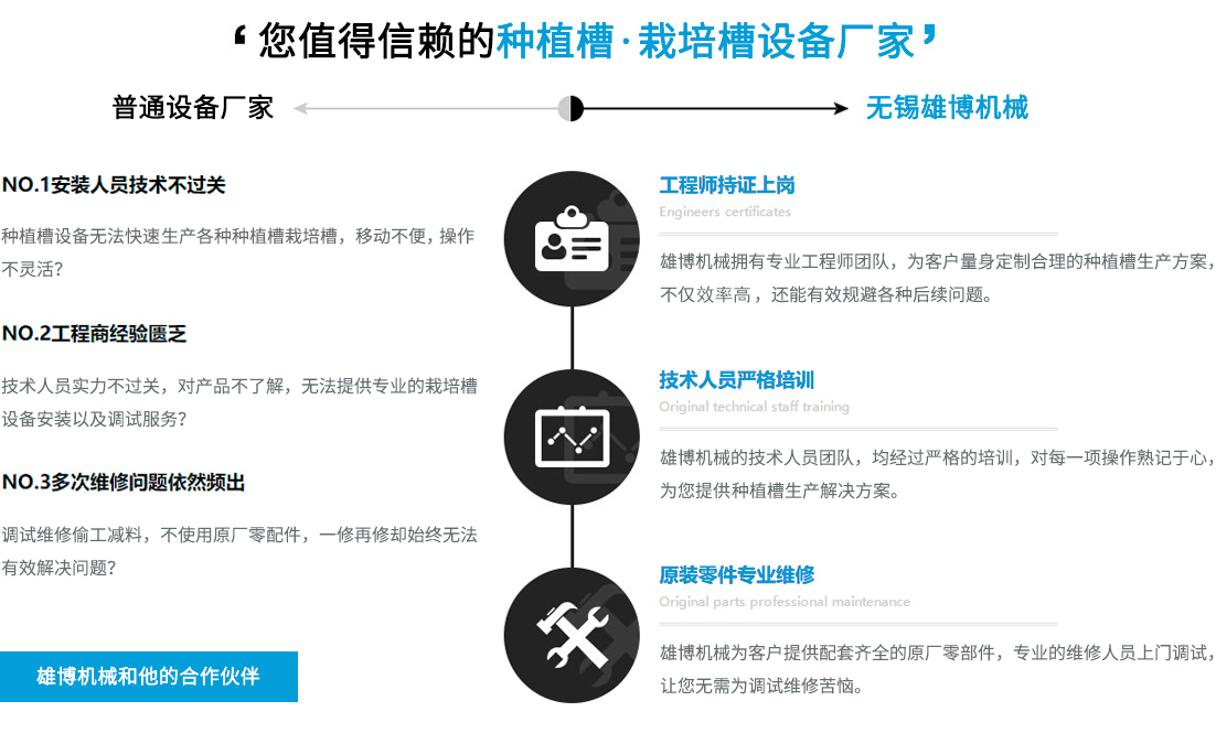 您在選擇雄博產(chǎn)品的同時(shí),也選擇無微不至的終身服務(wù)??筛鶕?jù)不同客戶實(shí)際需求進(jìn)行種植槽設(shè)備,栽培槽設(shè)備等的特殊工藝設(shè)計(jì)制造專業(yè)一對(duì)一售前/售后/技術(shù)咨詢指導(dǎo),享受更貼心/放心的設(shè)備使用體驗(yàn)。
